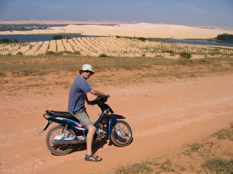 My first day on a small motorbike for at least 12 years. In the background are the white sand dunes.
