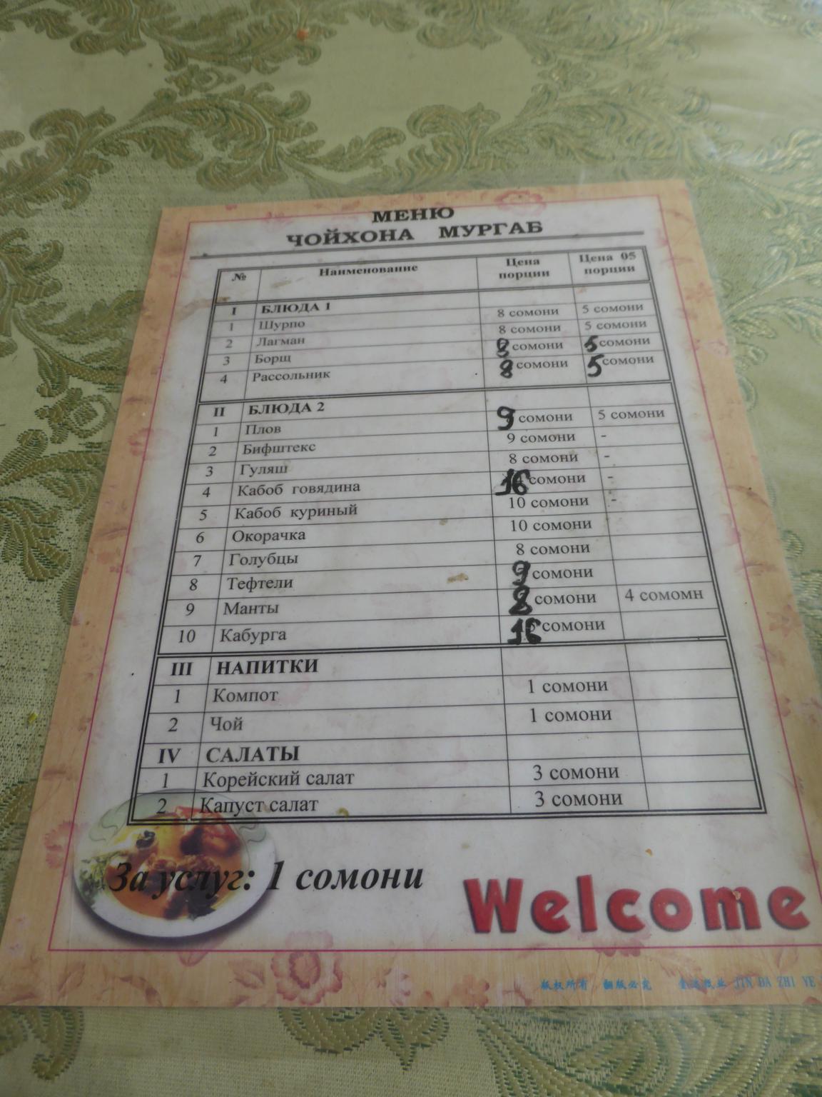 Menu in Khorog