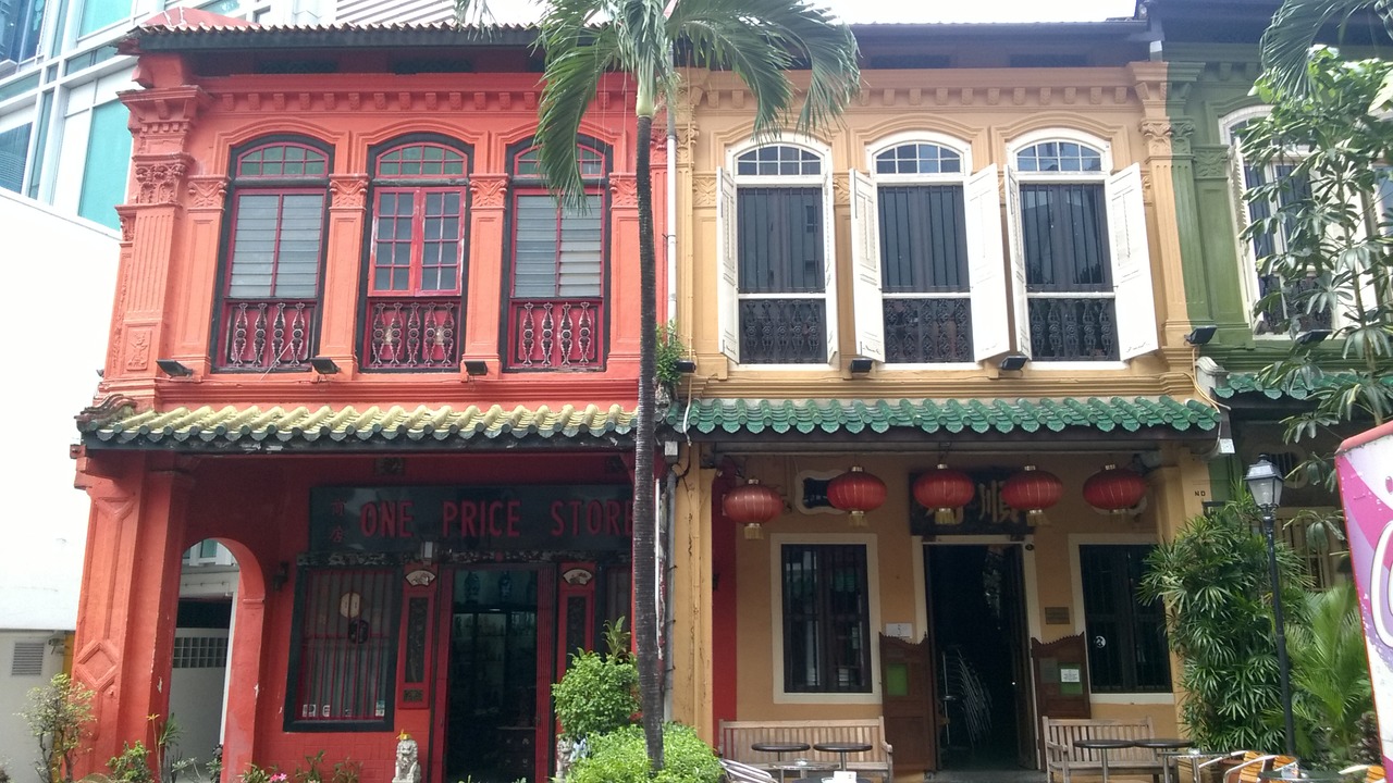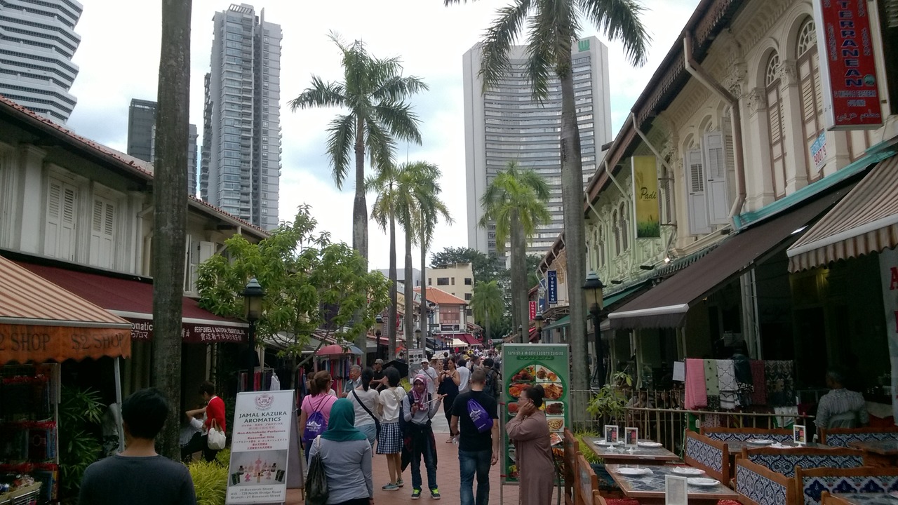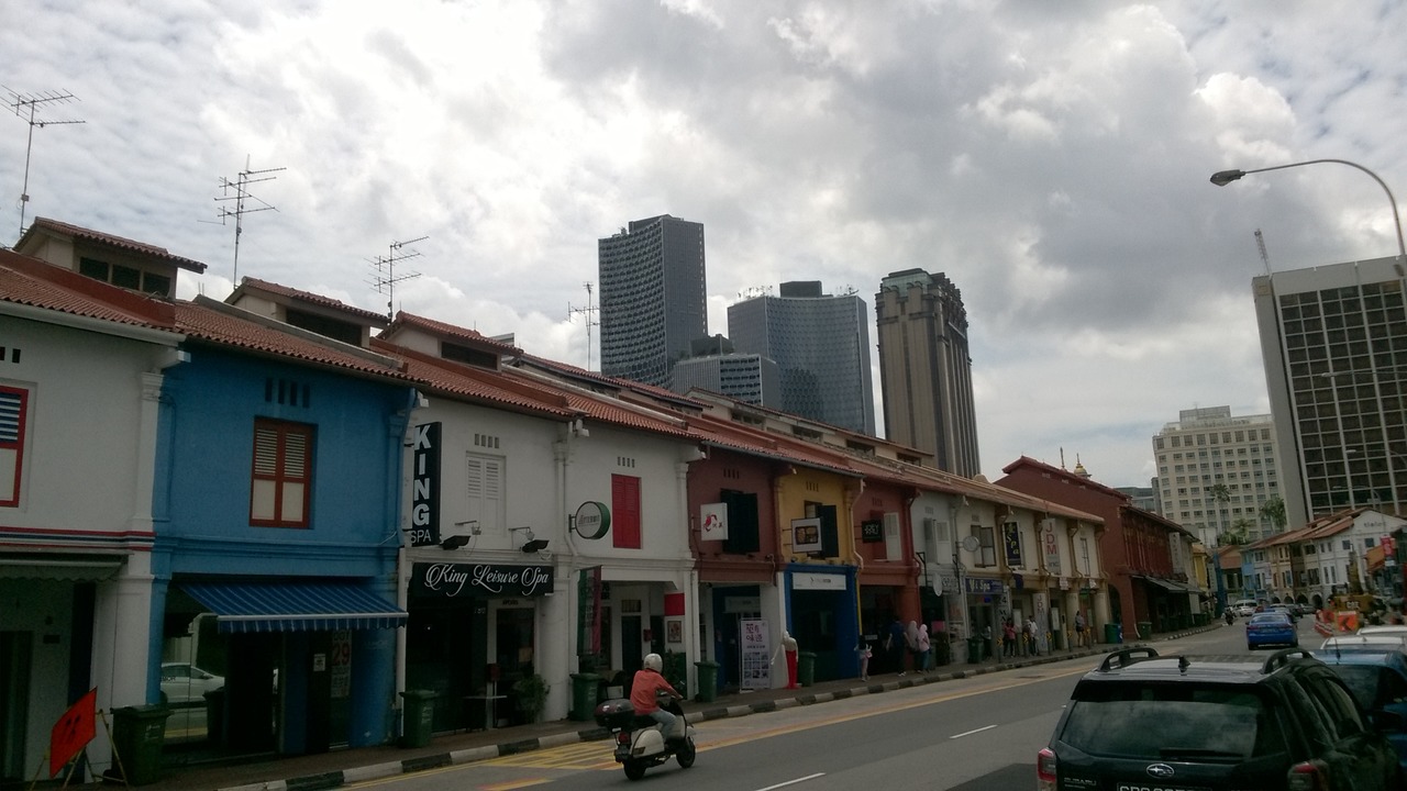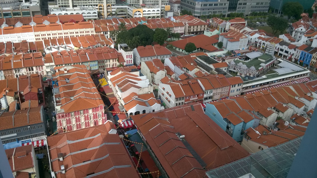 China town throughfare with the Pinnacle Duxton building in the distance