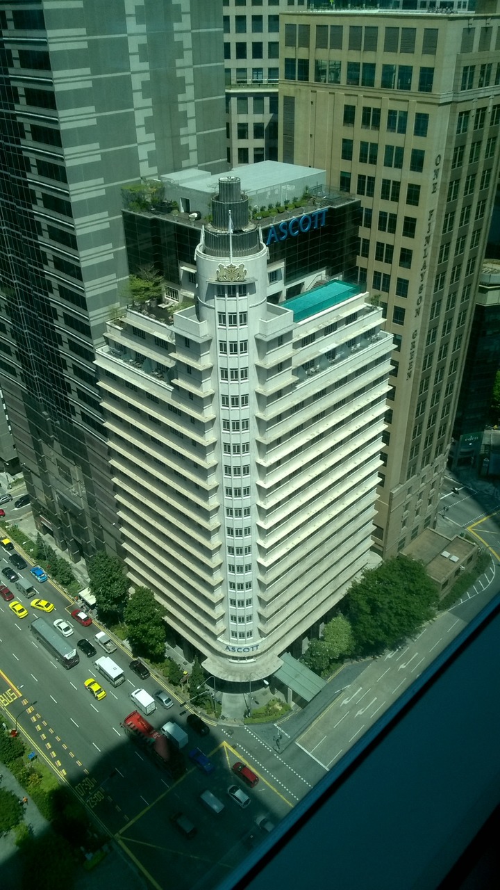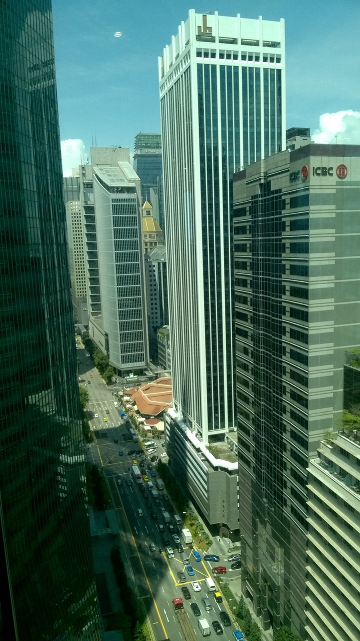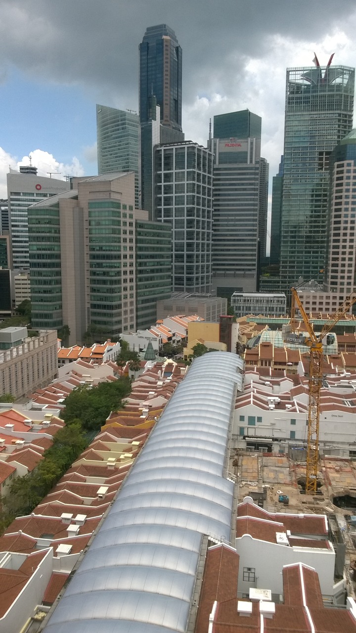 Look down on Raffles Quay with Telok Ayer hawker centre in the back